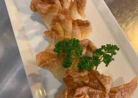 Cream cheese and crab meat wrapped in fried wonton..