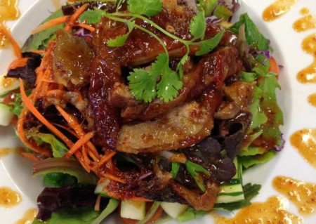 Roasted duck, romaine heart, spring mix, tomato, cashew nut and spicy chili sauce..