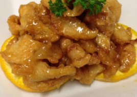 Crispy chicken sautéed in a homemade orange sauce.